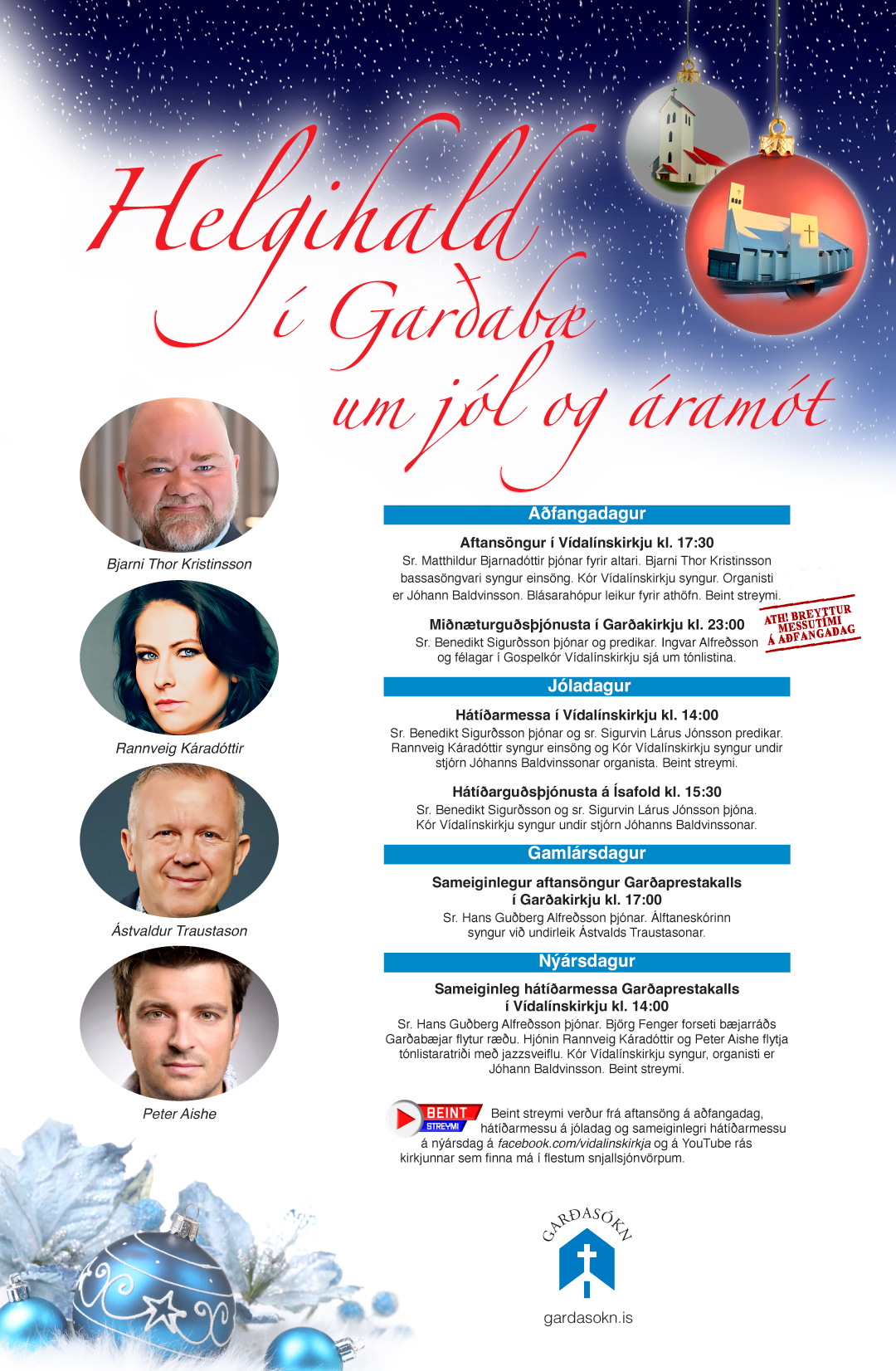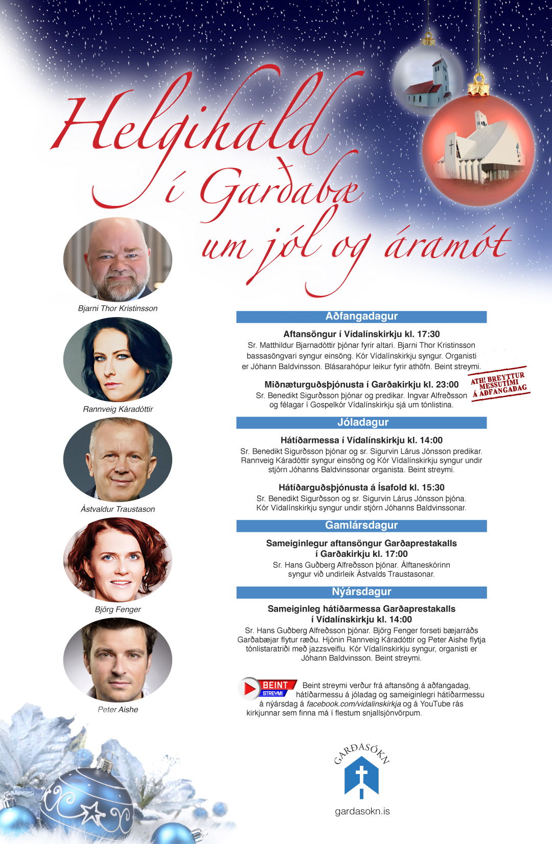 Hátíðleikinn mun sannarlega svífa yfir vötnum  í Garðakirkju og Vídalínskirkju um jól og áramót. Helgihaldið er samkvæmt hefðum, enda eru hefðir mikilvægar ekki síst um hátíðirnar. Tónlistin skipar ríkan þátt í athöfnunum og tónlistarfólkið er meðal þeirra fremstu á Íslandi í dag.  Rétt er að benda á að messutímum á aðfangadag var flýtt um hálftíma fyrir tveimur árum og af góðri reynslu verður sama fyrirkomulag aftur í ár. Aftansögnurinn í Vídalínskirkju hefst kl. 17:30 og miðnæturguðsþjónustan í Garðakirkju verður kl. 23:00.