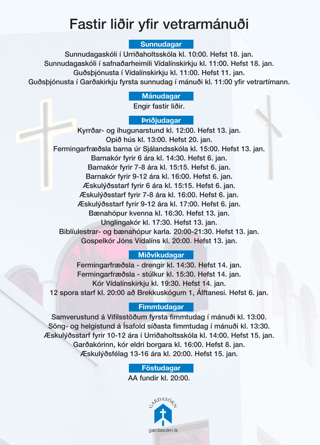 Í auglýsingunni hér að neðan má sjá fasta liði í safnaðarstarfinu og tímasetningar þeirra fram á vorið.